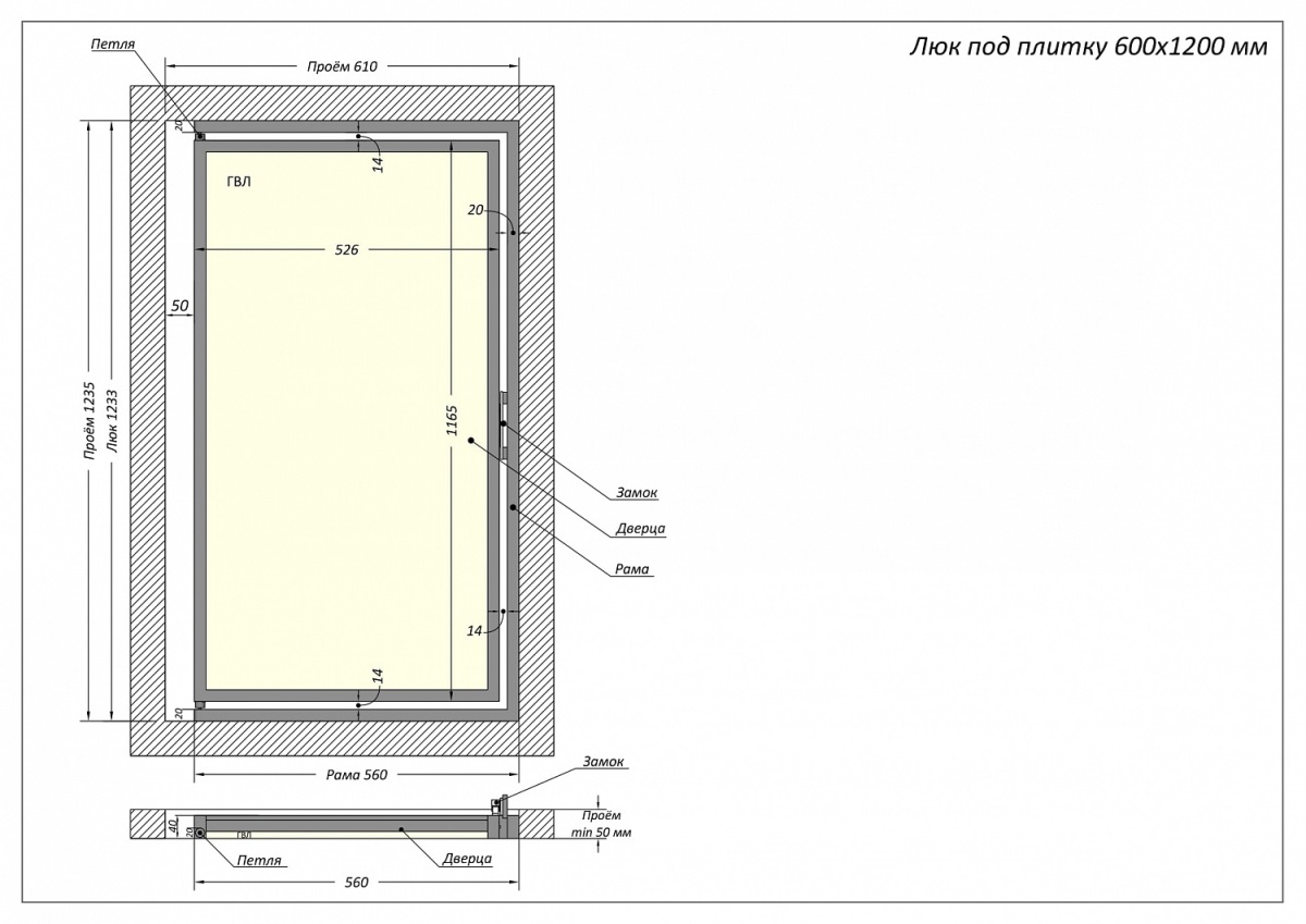 - Удобство использования: Одностворчатая конструкция и продуманный механизм открывания обеспечивают легкий и беспрепятственный доступ к коммуникациям. Петли позволяют открывать люк как в левую, так и в правую сторону, а также полностью снимать дверцу для большего удобства.